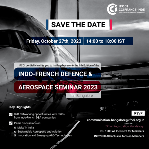 The Indo-French Chamber of Commerce & Industry (IFCCI), the official bilateral chamber fostering business relations between India and France, is organizing its most awaited and biggest business event of the year, the 6th edition of the flagship “Indo-French Defence & Aerospace Seminar” on Friday, the 27th of October 2023 in Bangalore. [Hotel TBC].