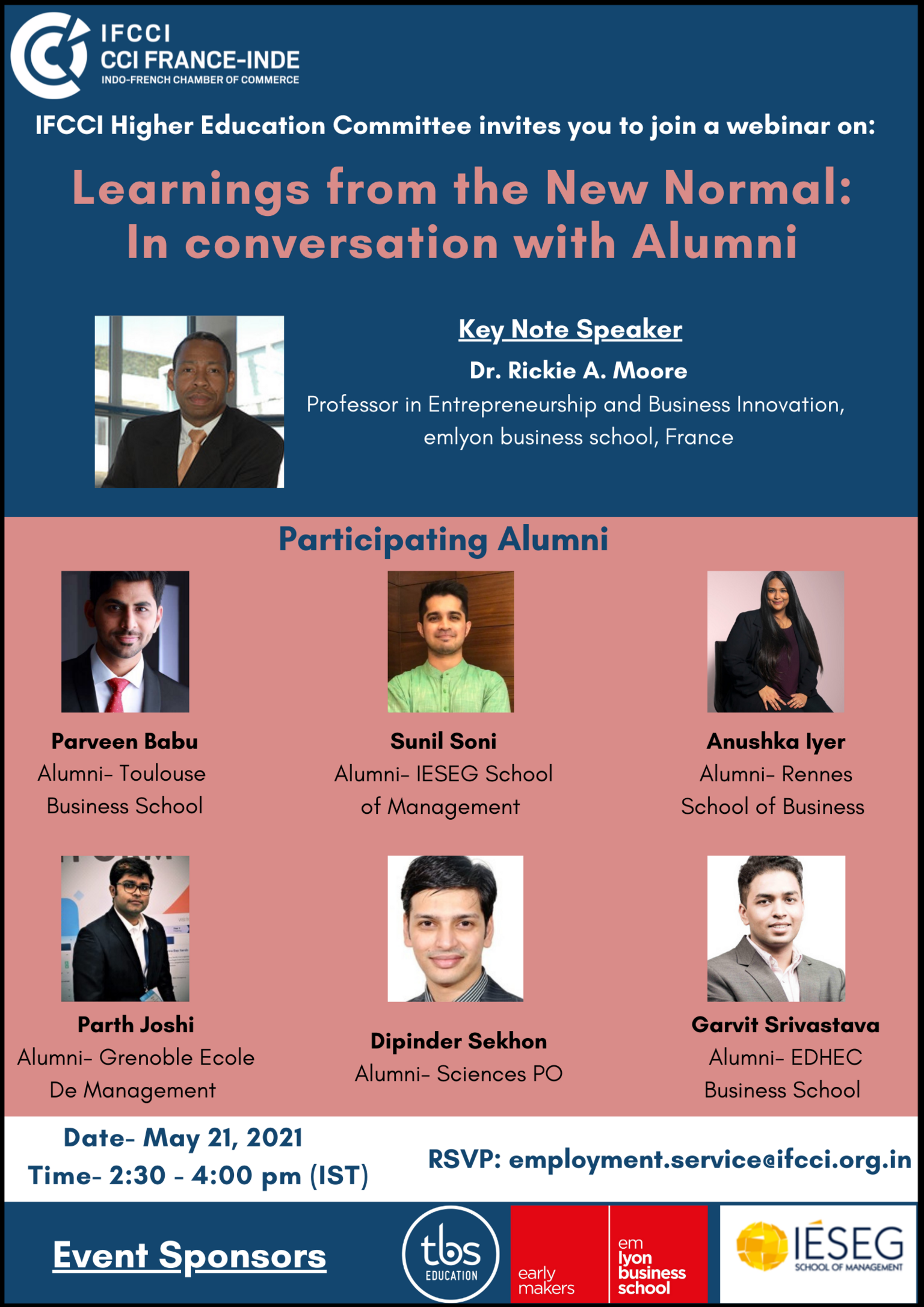 The global pandemic of Covid-19 is presenting the ultimate test of leadership across industries and geographies. Alumni of French and Indian Education institutes will share their personal & professional experiences and their success stories on how they turned challenges into an opportunity in the New Normal. This event will bring out interesting perspectives on how the Business leaders (Alumni) are managing the situation effectively.