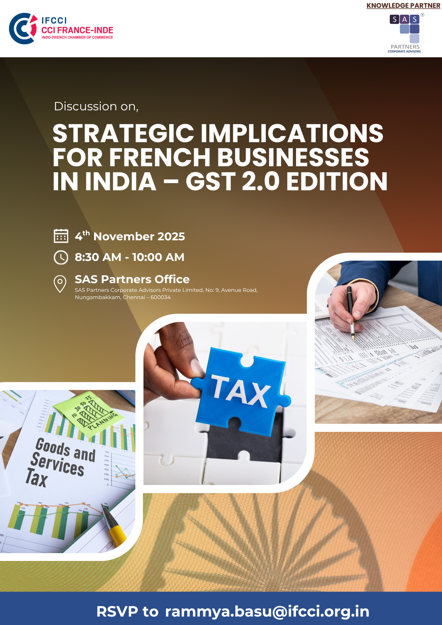 Building on the successful series of IFCCI Chennai networking meetings, we are pleased to announce our next meeting on the key topic "Strategic Implications for French Businesses in India – GST 2.0 Edition" on Tuesday, 4th November 2025 at the SAS Partners Chennai office between 0830 hrs and 1030 hrs. The primary objective of the meeting is to facilitate an open discussion and provide a platform to discuss and understand the implications of GST 2.0.