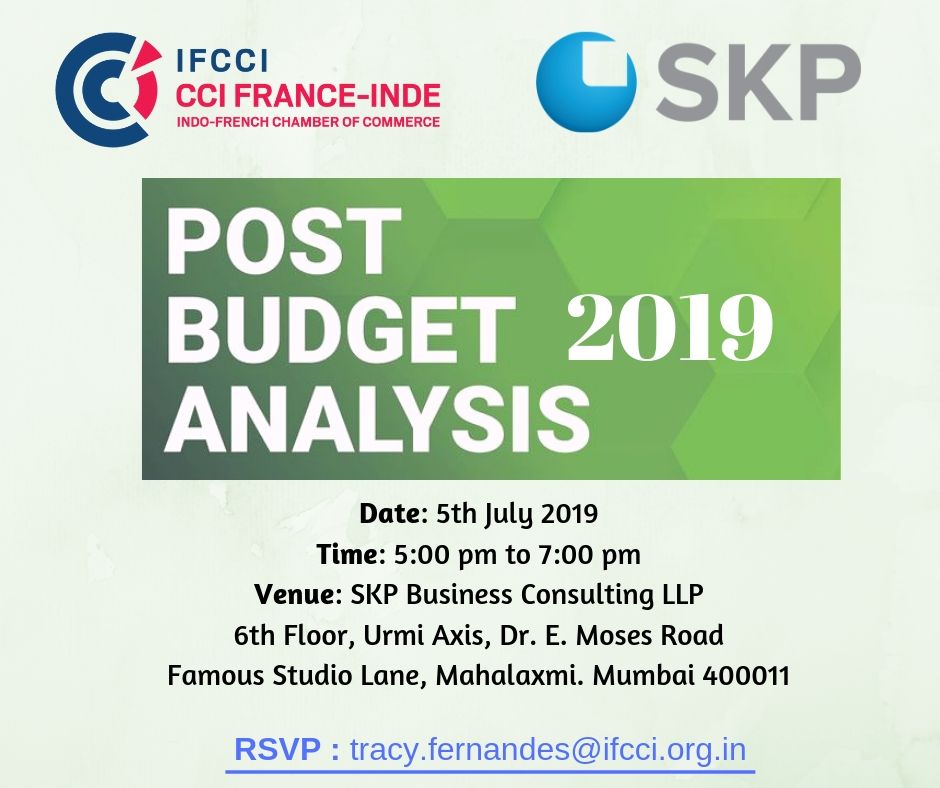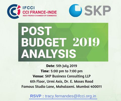 The Indo-French Chamber of Commerce and Industry in association with SKP Business Consulting LLP is organising a Post Budget Analysis in Mumbai on 5th July 2019.