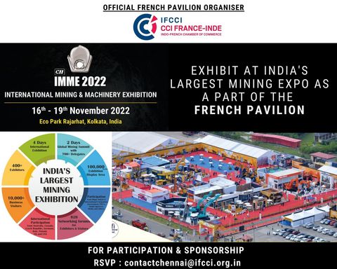 Indo-French Chamber of Commerce is organizing the Official French Pavilion at IMME 2022 Exhibition organised by CII. IMME 2022 is the16th edition of International Mining and Machinery Exhibition (IMME) - India's only focussed fair for the Mining Industry from 16 to 19 November 2022 at Rajarhat, Kolkata, India.