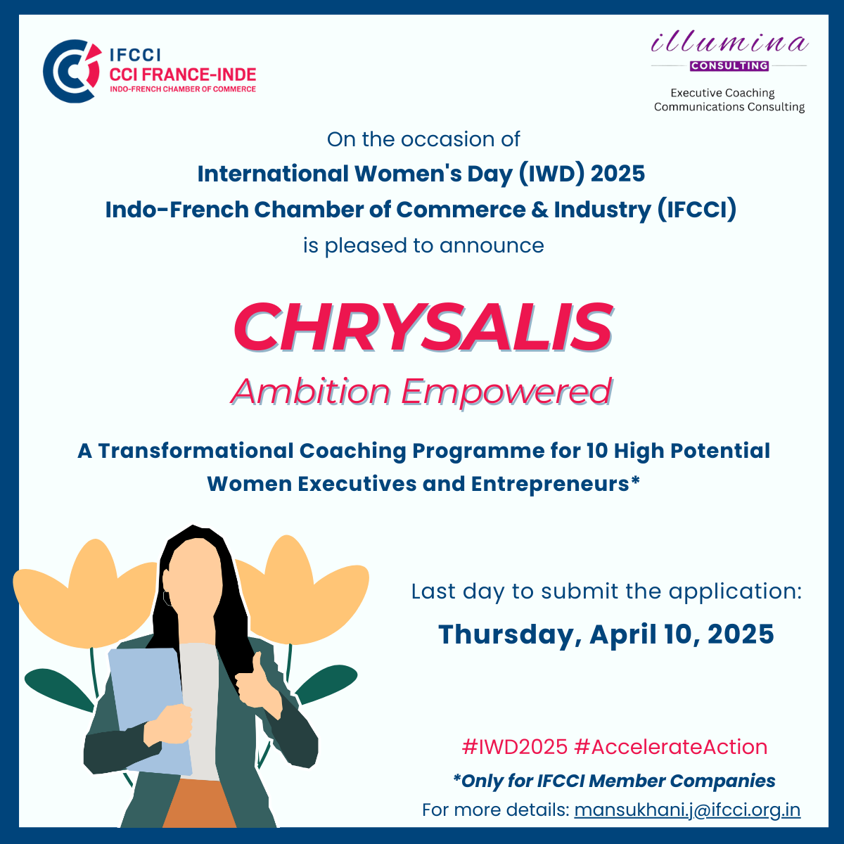 On the occasion of International Women's Day (IWD) 2025, Indo-French Chamber of Commerce & Industry (IFCCI) in association with illumina Consulting is pleased to announce the launch of a Transformational Coaching Programme for 10 high potential women executives and entrepreneurs from our member companies.