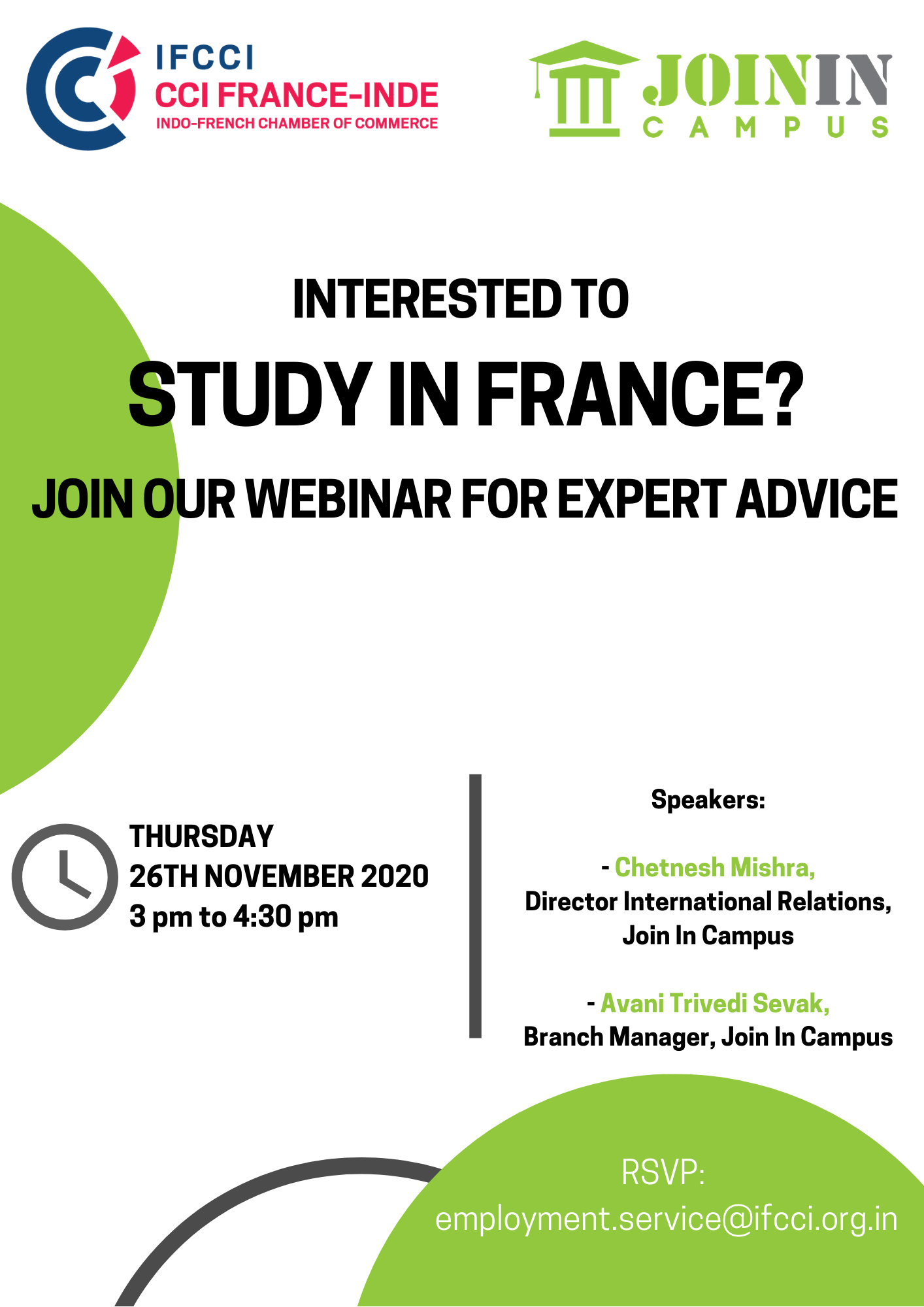 IFCCI in association with Join In Campus is organising a webinar named 'Interested to study in France ?', giving information on why to study in France