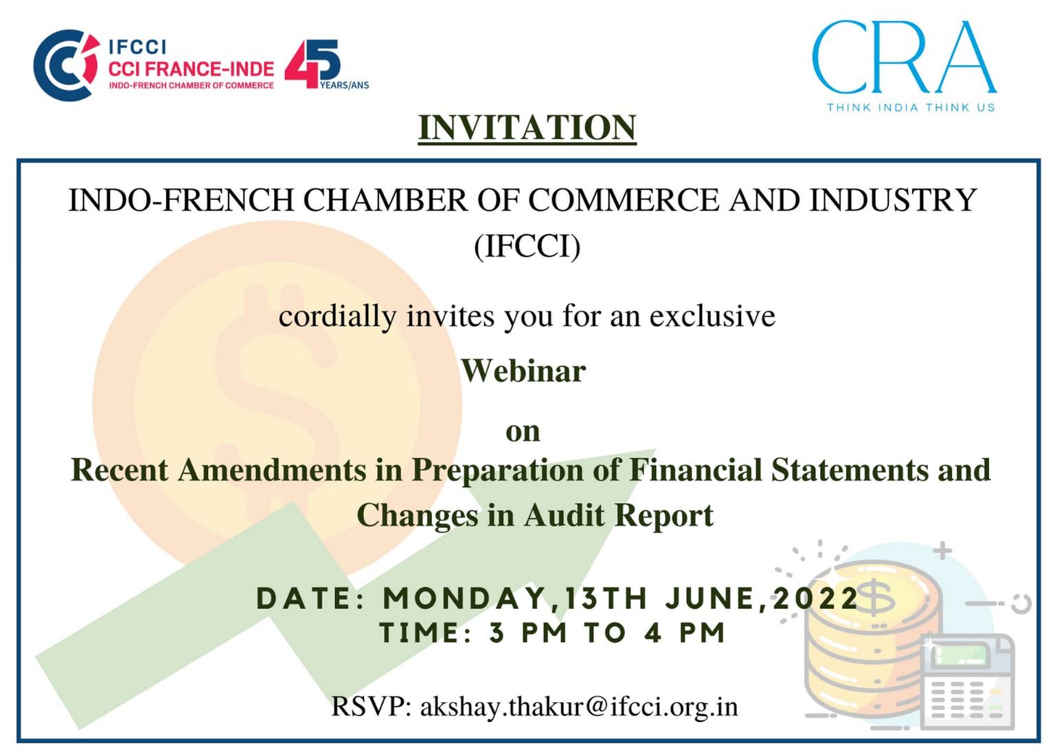 The Indo-French Chamber of Commerce and Industry (IFCCI), in association with CRA & Associates, is organizing a Webinar on Recent Amendments in Preparation of Financial Statements and Changes in Audit Report