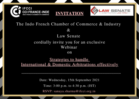 The Indo-French Chamber of Commerce and Industry in association with Law Senate is pleased to invite you for an exclusive Webinar on Strategies to handle International & Domestic Arbitrations effectively in India On Wednesday, 15th September 2021 3:00 p.m. - 4:30 p.m. (IST) Program: 3:00pm - 3:05 pm: Welcome remarks by Ms. Payal S.Kanwar, Director General, IFCCI 3:05pm - 3:20pm: Introductory Remarks and Brief Presentation by Mr. S Ravi Shankar, Senior Partner and Arbitration Expert Lawyer, Law Senate 3:20pm - 4:00pm: Fireside Chat