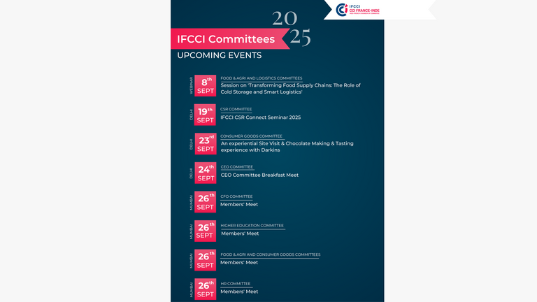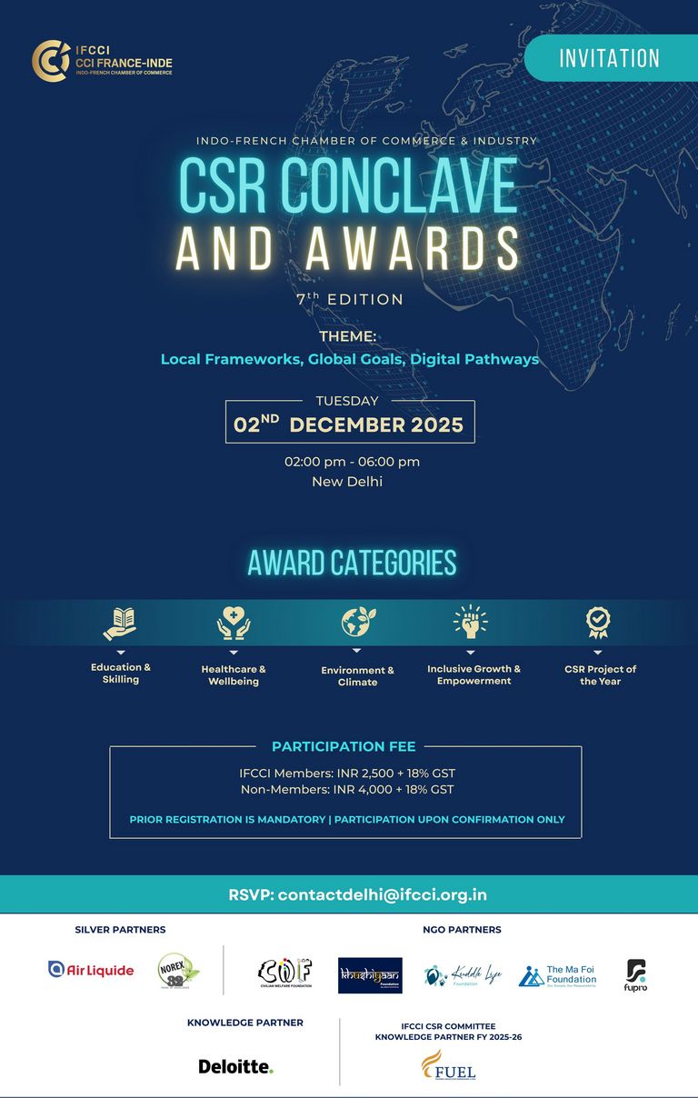 L'IFCCI a le plaisir d'annoncer la 7e édition du Conclave et des Prix RSE 2025 de l'IFCCI sur le thème « Cadres locaux, objectifs mondiaux, voies numériques », qui se tiendra le 2 décembre 2025 à New Delhi.