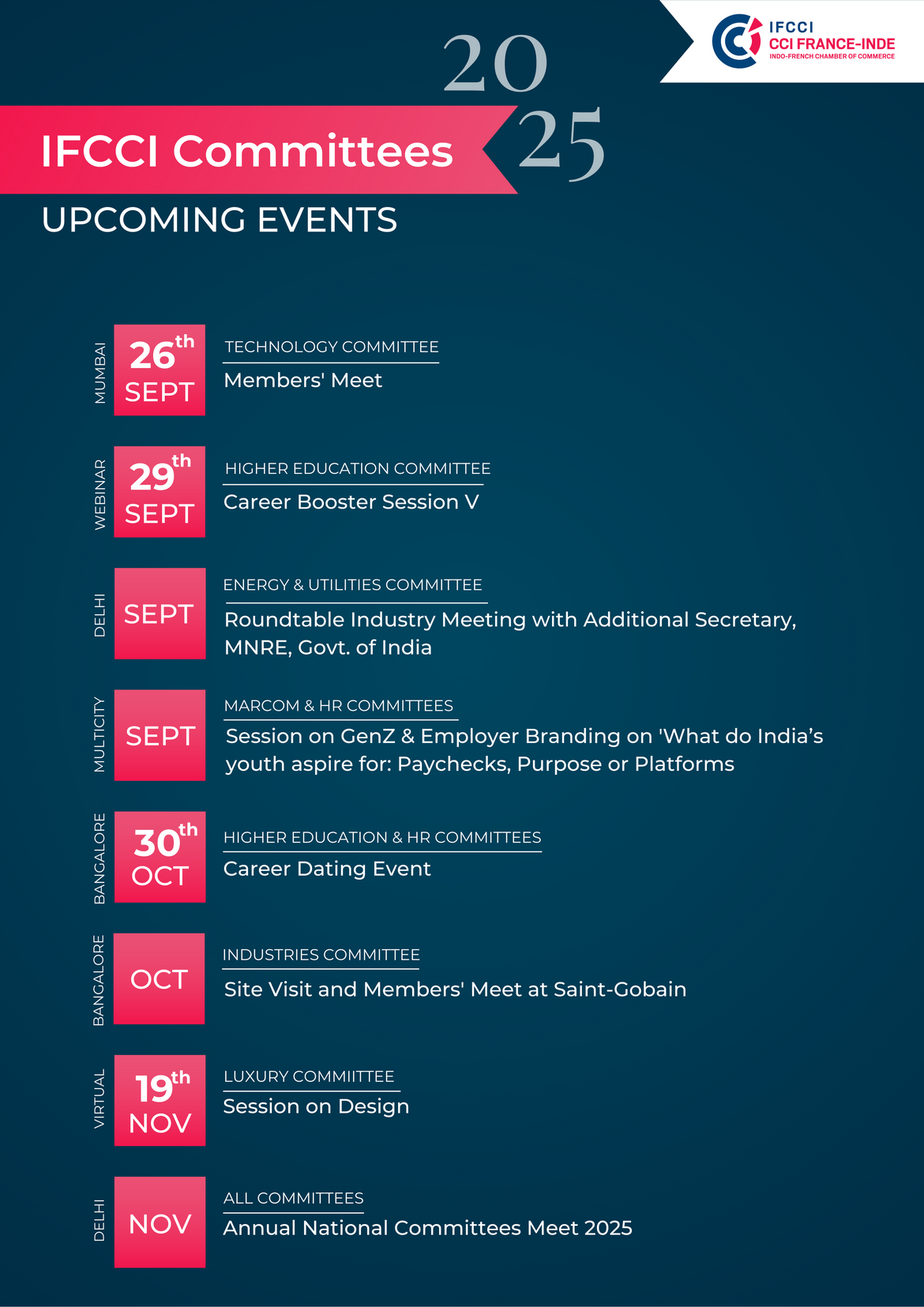 La Chambre de commerce et d'industrie franco-indienne en Inde est heureuse de partager avec vous le calendrier des activités des comités pour la période novembre-decembre 2025.