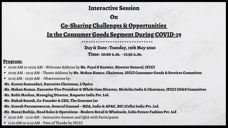 IFCCI organized an Interactive Session on Co-sharing Challenges and Opportunities in the Consumer Goods segment during COVID-19 on Tuesday, 19th May 2020. The three most important challenges that companies, consumers and all the stakeholders are facing were discussed. Various new innovative practices to effectively function during Covid 19 were also elaborated.