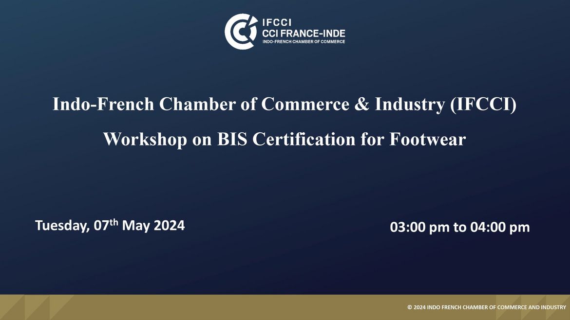 The Indo-French Chamber of Commerce & Industry (IFCCI), in collaboration with the Bureau of Indian Standards (BIS), Department of Consumer Affairs, Govt. of India, organized an interactive virtual workshop on BIS Certification for Footwear on 7th May 2024.