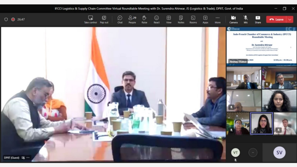 The Indo-French Chamber of Commerce and Industry (IFCCI) convened a virtual Roundtable meeting with Dr. Surendra Ahirwar, Joint Secretary- Logistics and Trade, Department for Promotion of Industry and Internal Trade (DPIIT), Ministry of Commerce and Industry, Government of India, on 22nd February 2024.