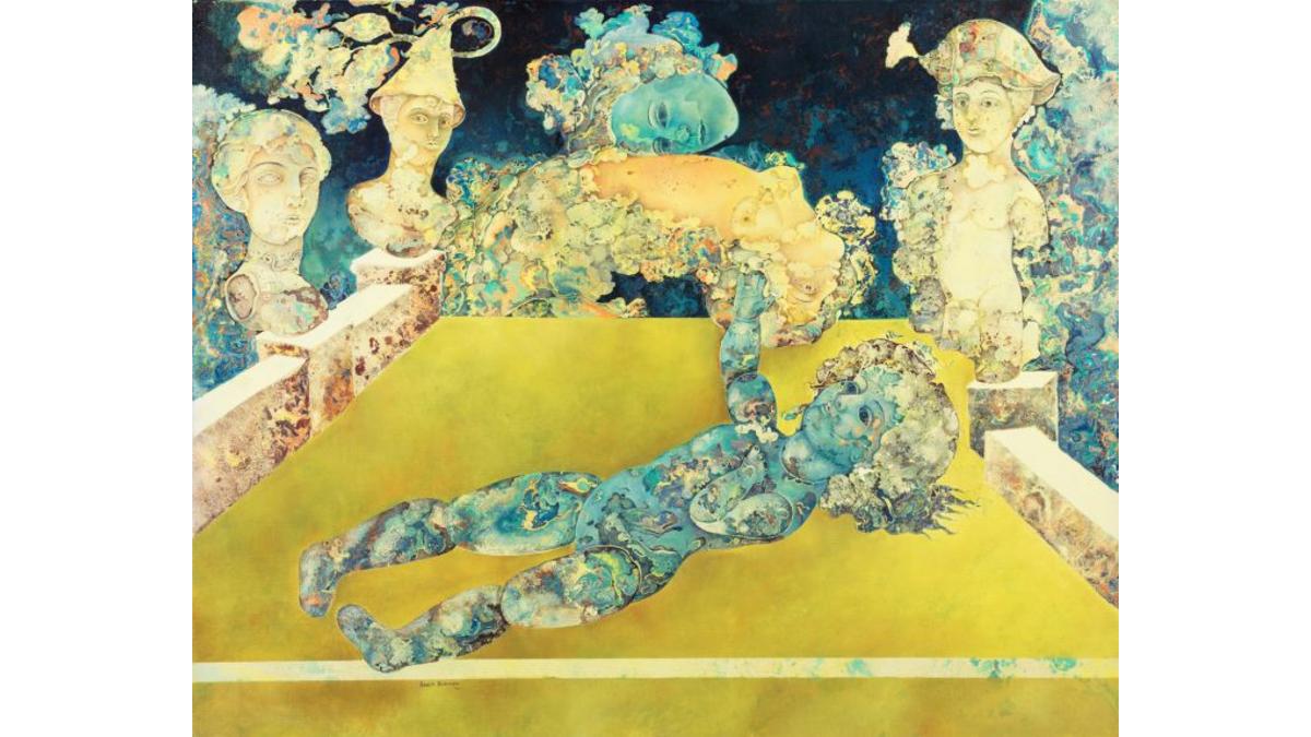 In addition to paintings, the exhibit showcases sculptures from the legendary Prodosh Dasgupta, who was pivotal in forming India’s first ensemble of modern artists after returning from London and Paris in 1943. Inspired heavily by expressionists, he developed a fluid abstract style that conveyed his deep interest in Eastern philosophy. DAG features notable works in bronze, such as “Nest” (1975), “Halves” (1979) and “Genesis I” (1971), which mark his style of containing abstract ideas within the roundedness of his trademark ovoid shapes.